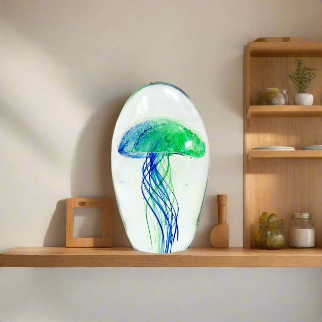Make a statement in your home with the Nemo 12cm, a breathtaking glass dome art piece expertly handcrafted with a vibrant bi-colour jellyfish design in bright blue and green. Measuring 12.5cm in height and 23.5cm in circumference, this stunning piece is sure to captivate.