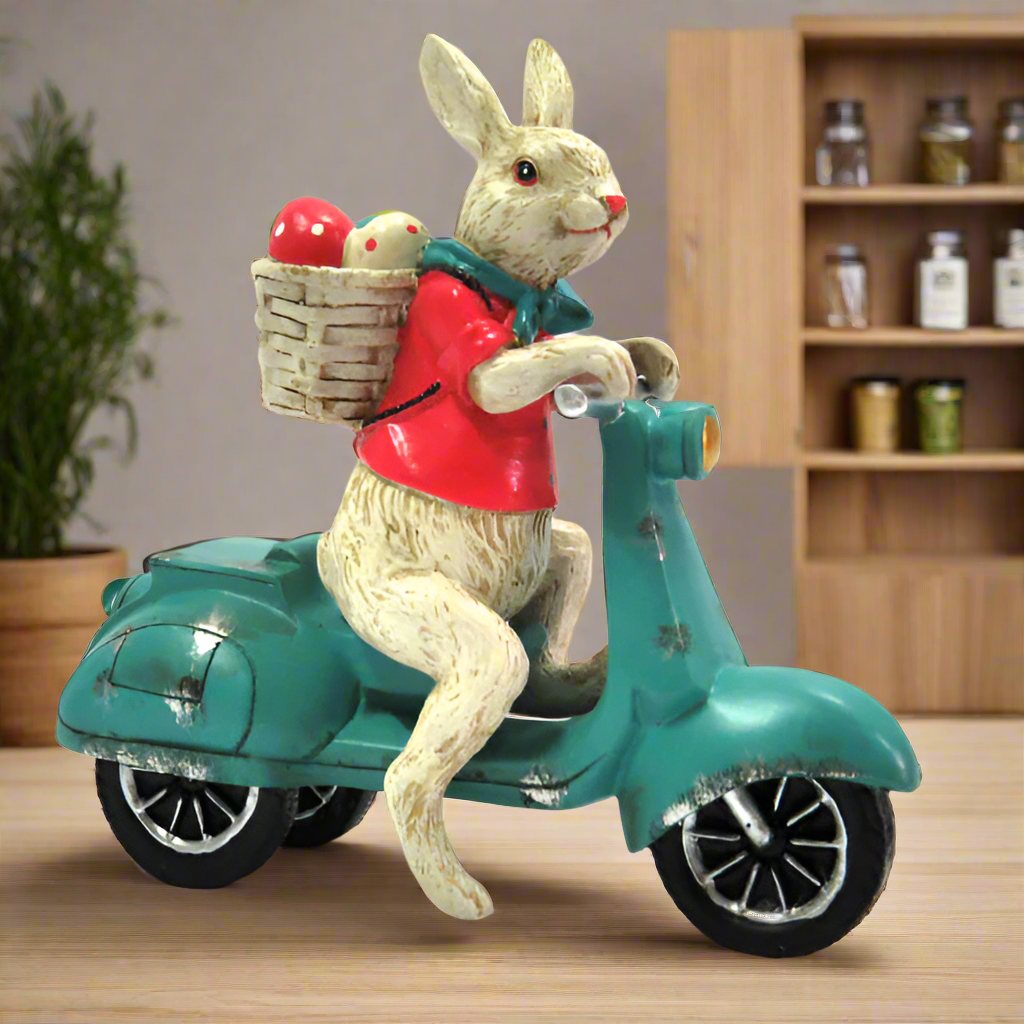 Meet the Vespa Rabbit, a unique and stunning handcrafted piece of art that combines whimsy and style. Expertly painted and detailed, this charming resin sculpture features a rabbit riding a Vespa, adding a touch of playfulness to any room.