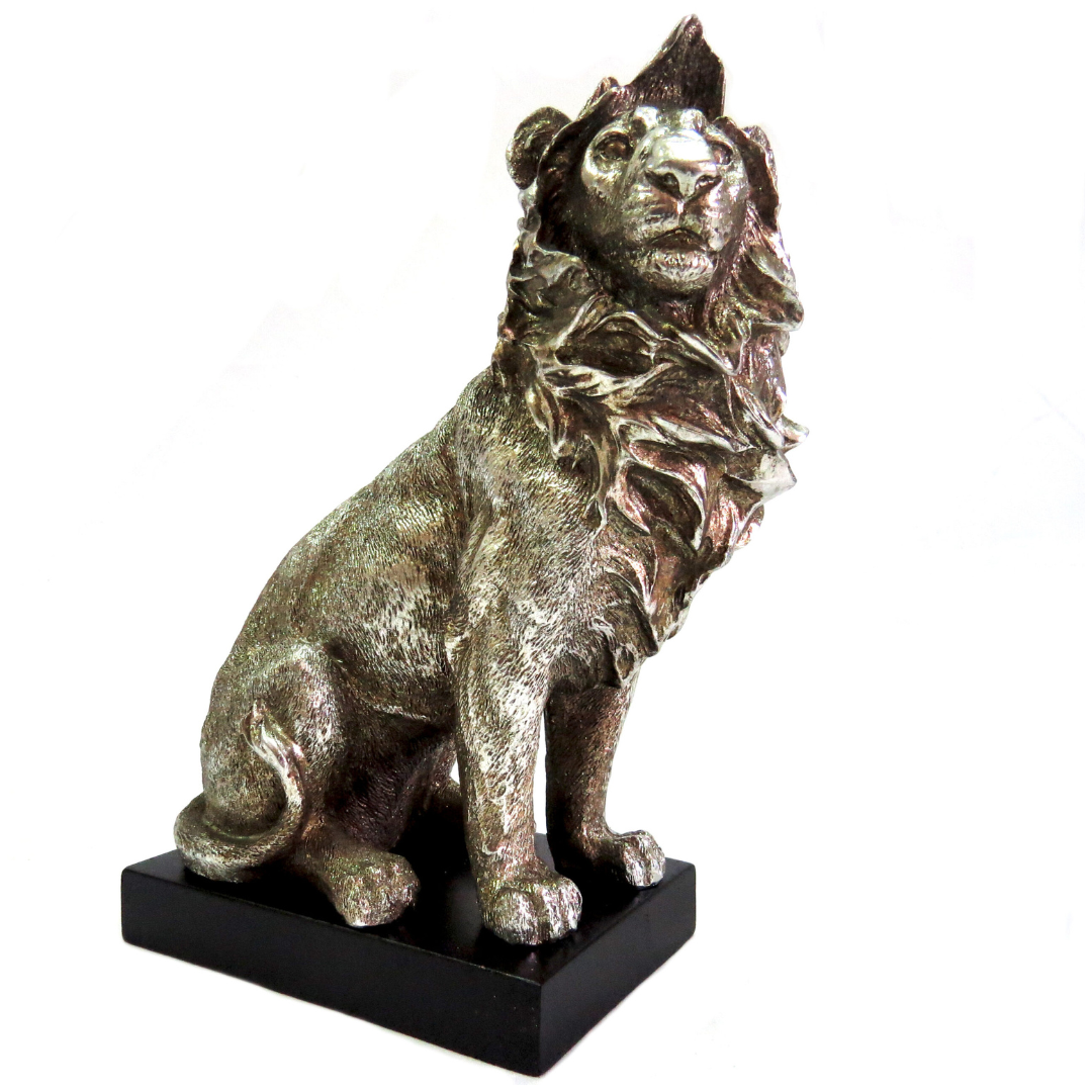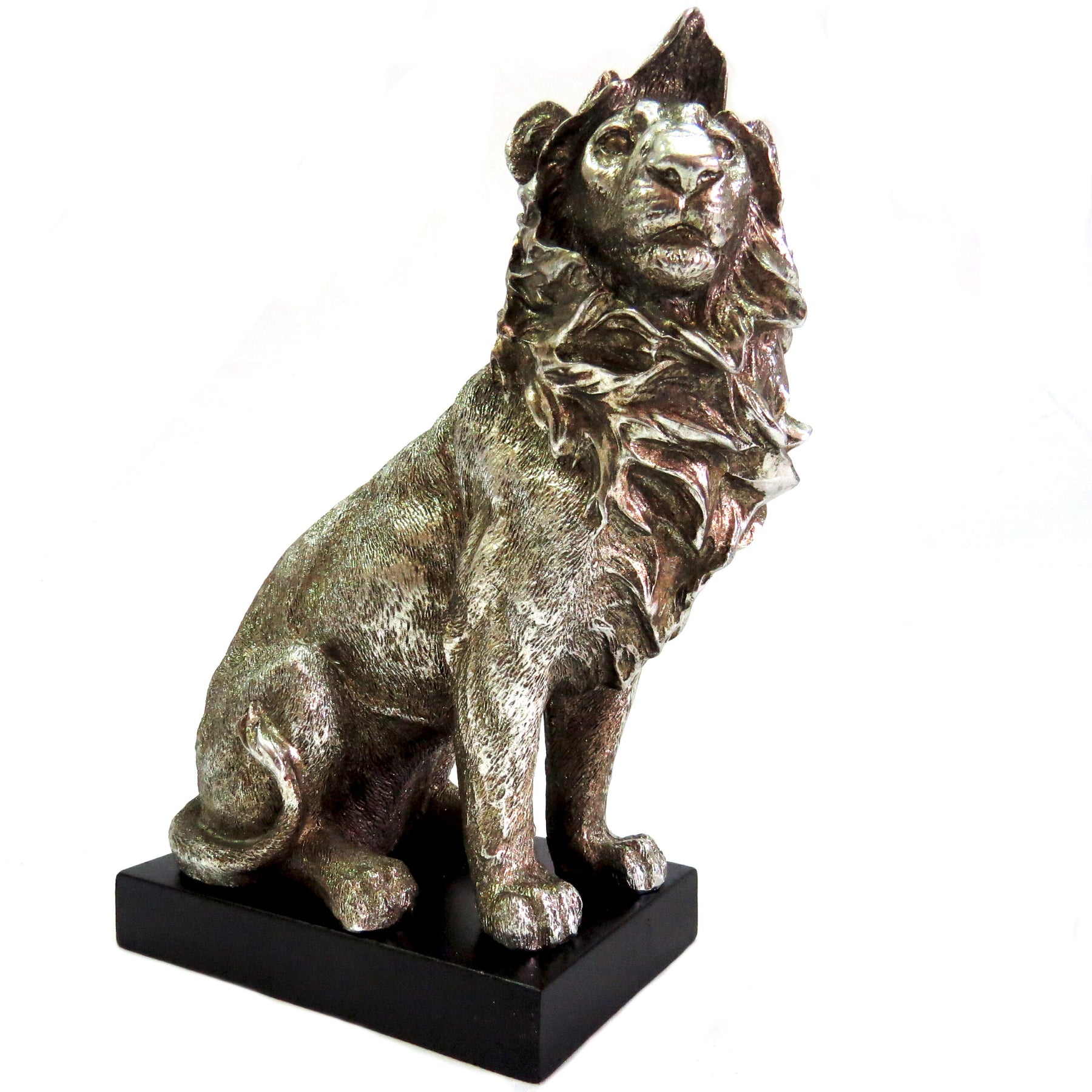Introducing the majestic Zimbo Lion, a stunning antique silver collectible that's sure to impress. This beautifully crafted lion stands proudly on a black plinth, showcasing its impressive size and intricate details.