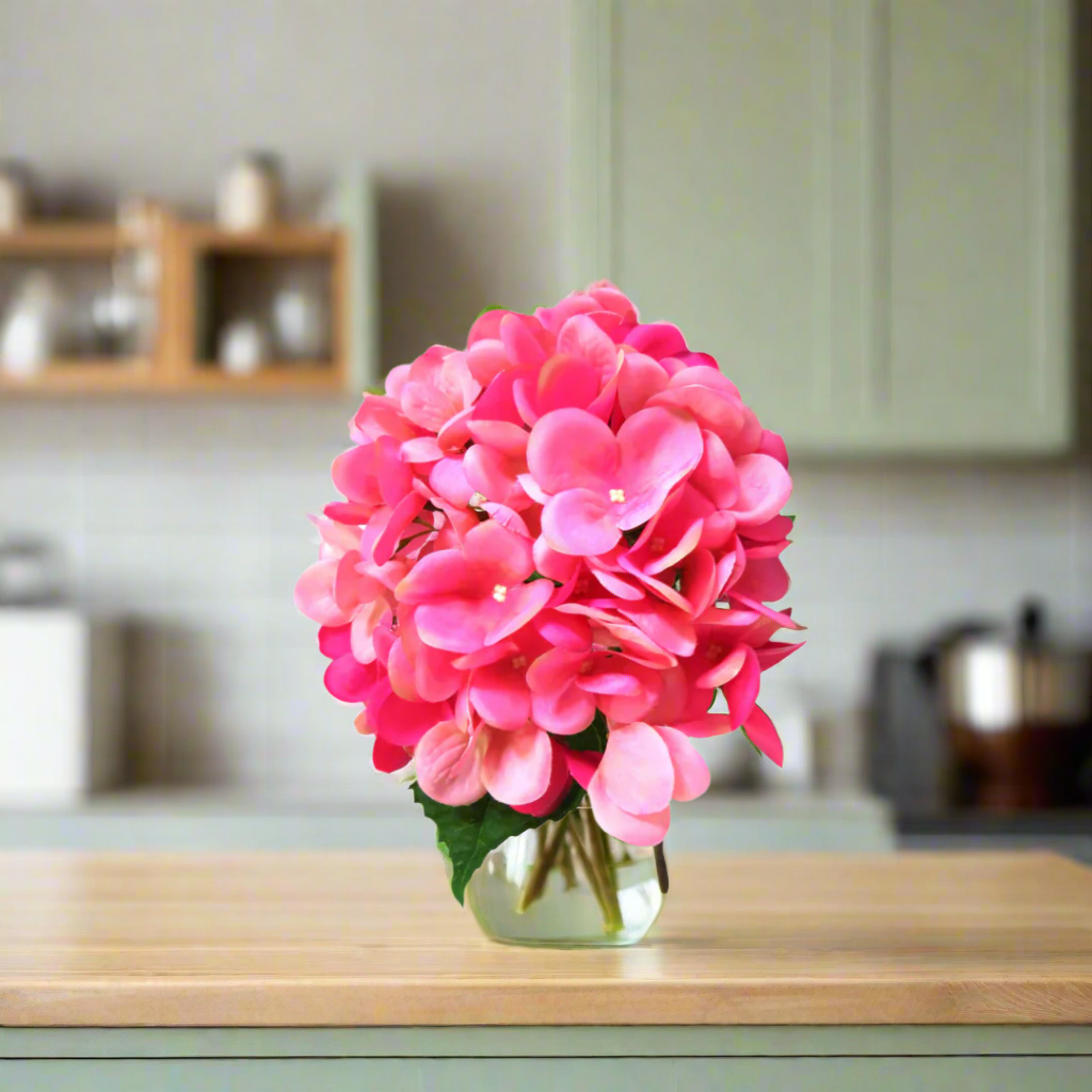 Bright and Cheerful: Our Hydrangea Pink Lightning artificial flowers are perfect for adding a pop of color and energy to any room.