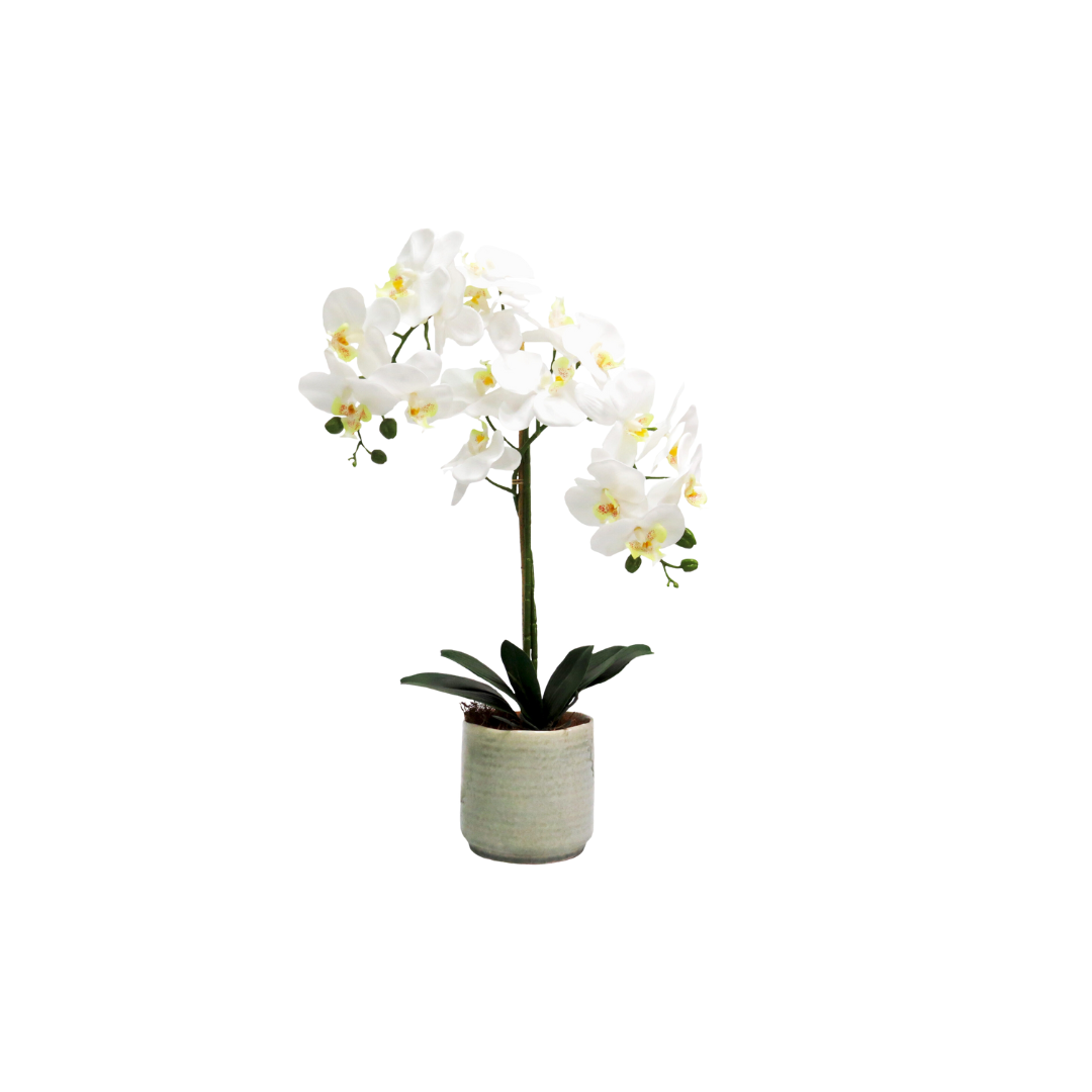 Elevate your space with the serene beauty of this real-touch orchid arrangement, "Serene Soulmates." This stunning composition features two gorgeous phalaenopsis orchids arranged with leaves in a beautifully crafted, soft mist grey ceramic pot.