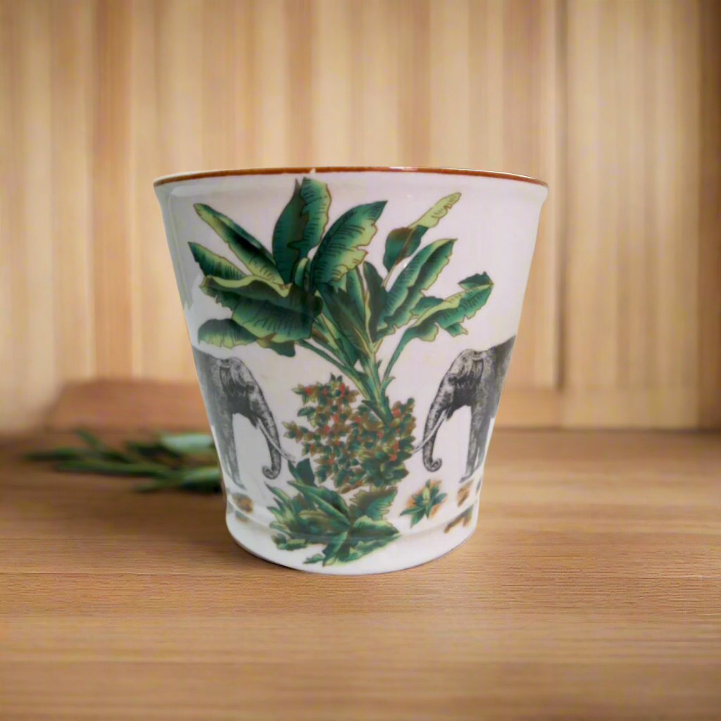 Add a touch of exotic elegance to your home with this stunning Origins Pot. Crafted from high-quality porcelain, it features a vibrant pattern of elephants and palm trees that will transport you to a tropical paradise.