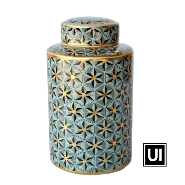 GREEN, BLACK & GOLD GEOMETRIC DESIGN JAR WITH LID.