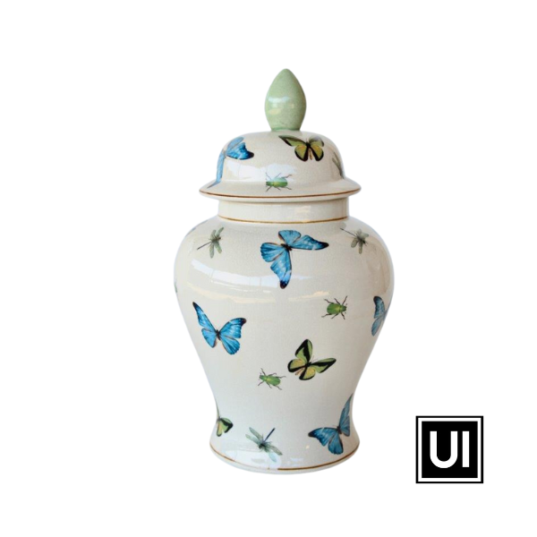 DUCK EGG BLUE & GOLD DRAGONFLY JAR WITH LID 16.5X19CM