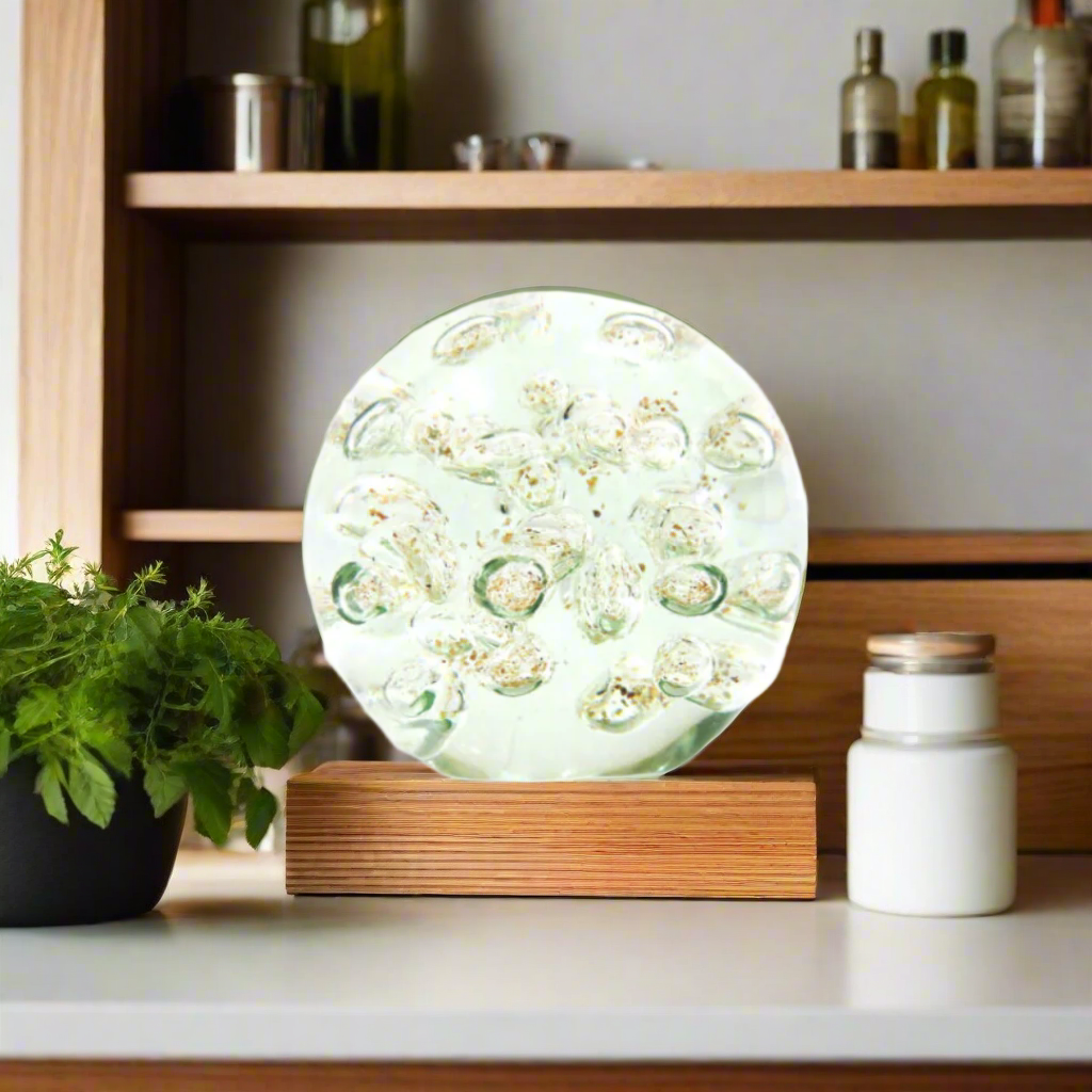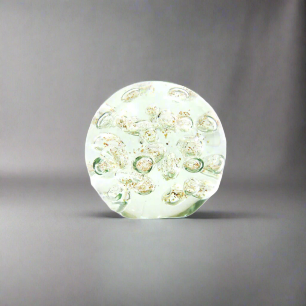Elevate your space with the breathtaking Moonball 10cm, a stunning glass ball featuring delicate floating glass bubbles and luxurious gold dust. This exquisite piece of glass art adds a touch of glamour and sophistication to any room.