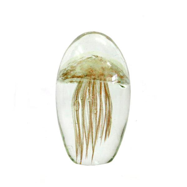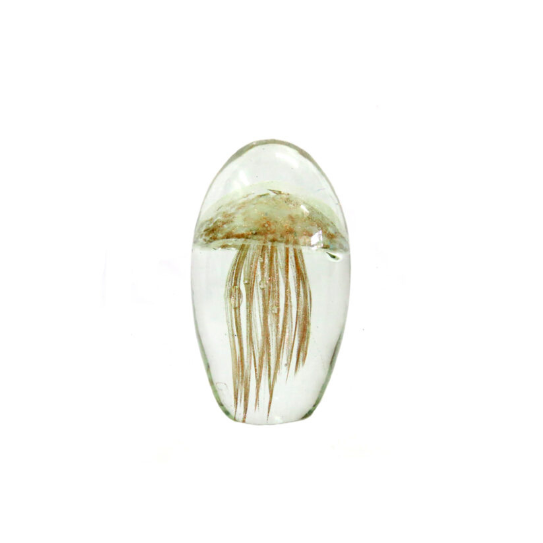 The Octo 12cm is a breathtakingly beautiful, handmade clear glass decorative piece that stands at 12cm. Adorned with a stunning jellyfish shape in frosted gold and spun copper tentacles, this piece is truly a sight to behold.