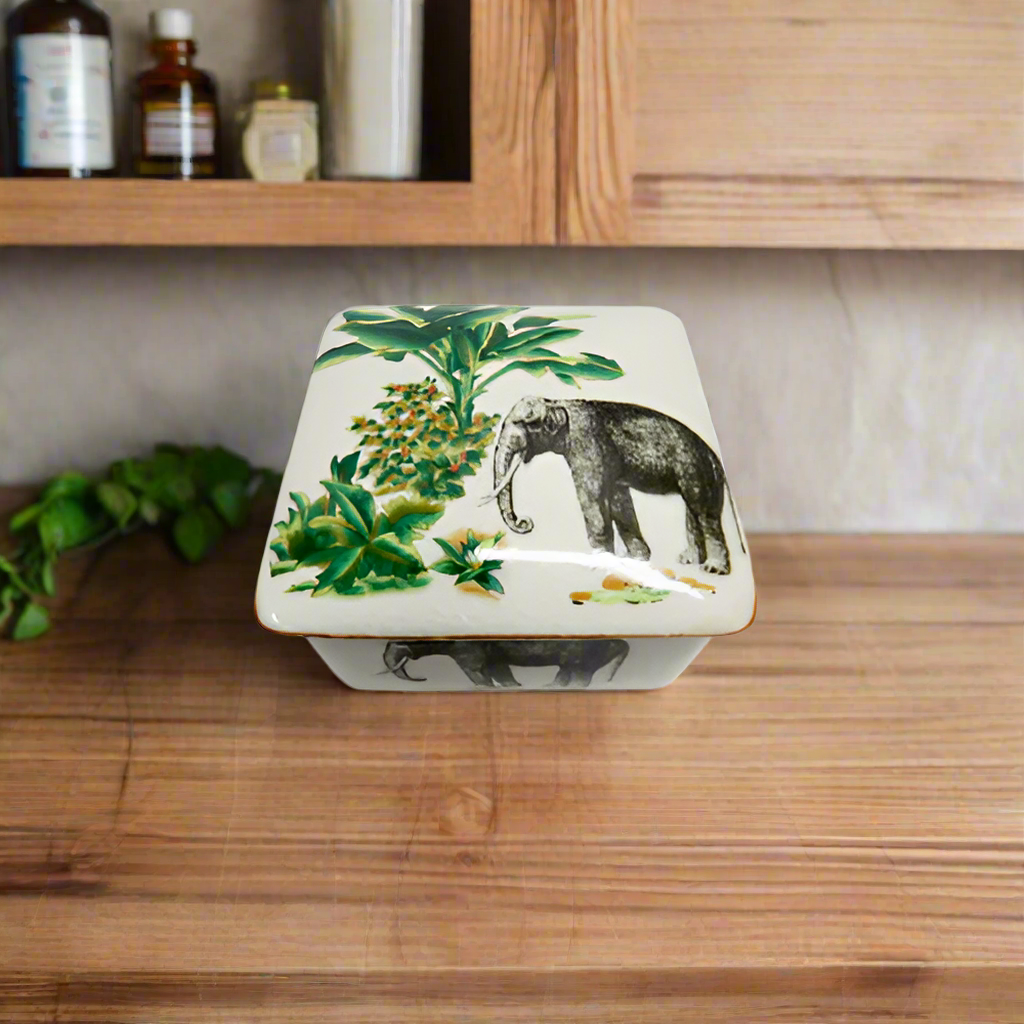 Add a touch of tropical charm to your home with this adorable Palm Elephant Box. Made from ceramic porcelain, it features a delightful square design with an elephant and palm trees.