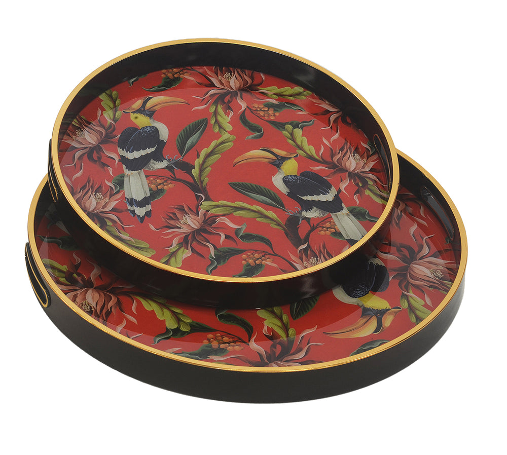 GLASS TRAY ROUND RED TOUCAN SET OF 2
