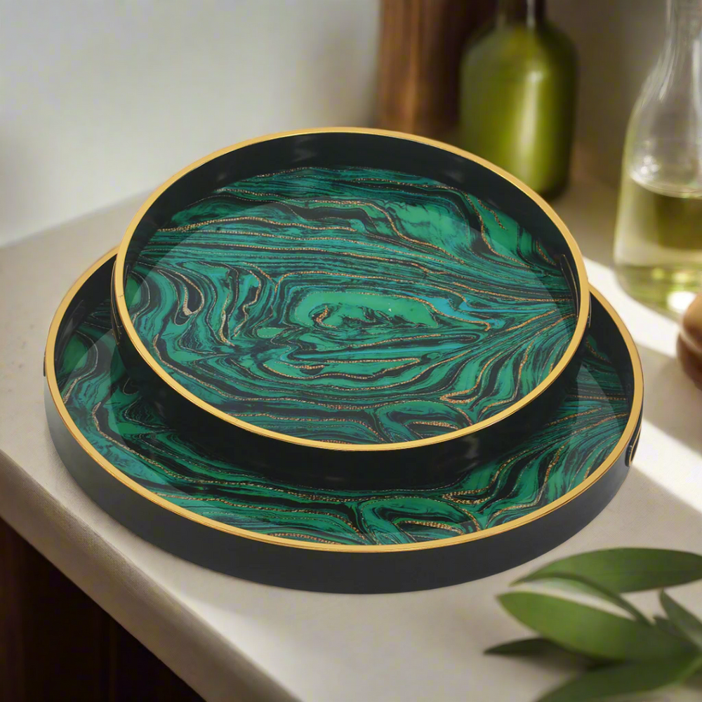 GLASS TRAY ROUND TURQUOISE SET OF TWO