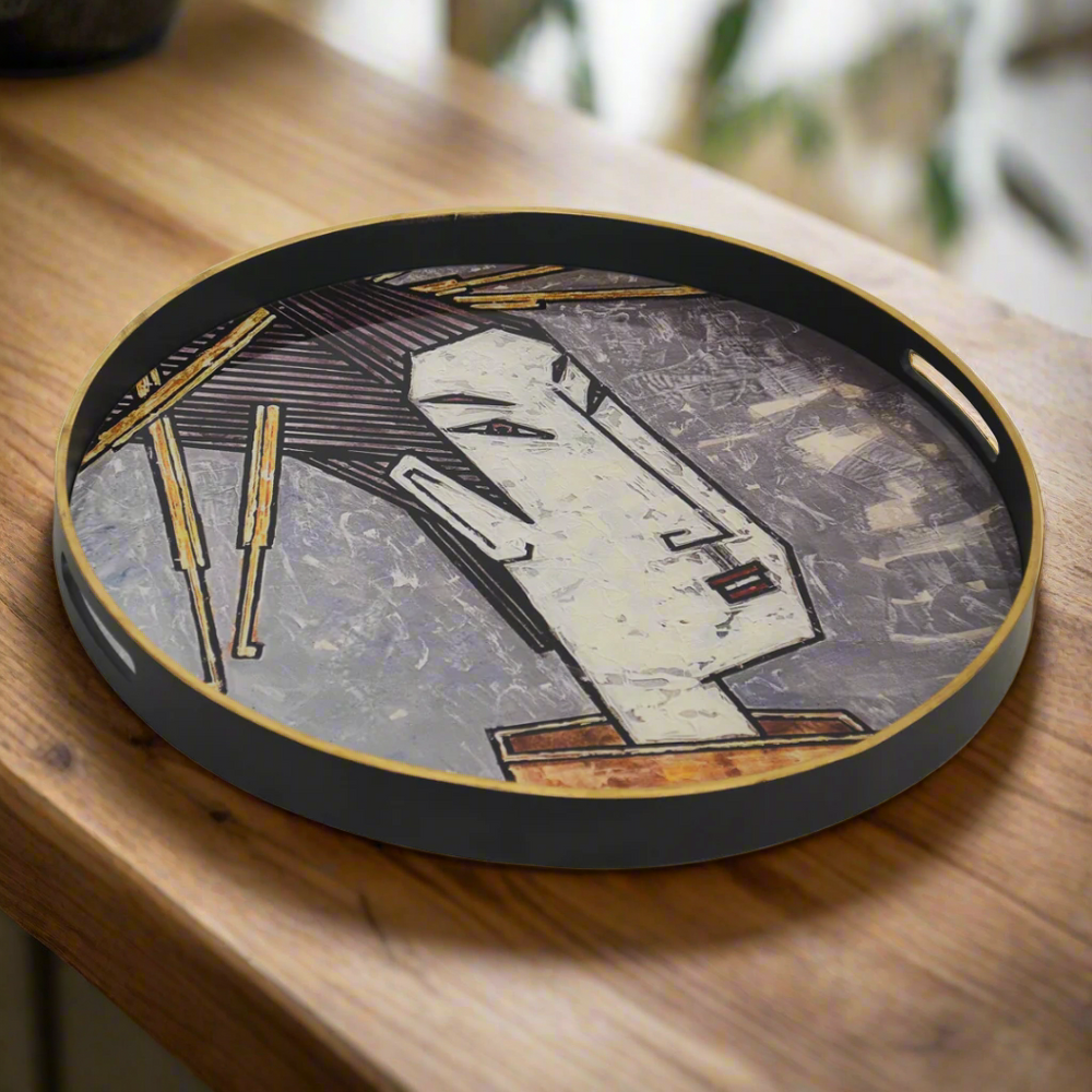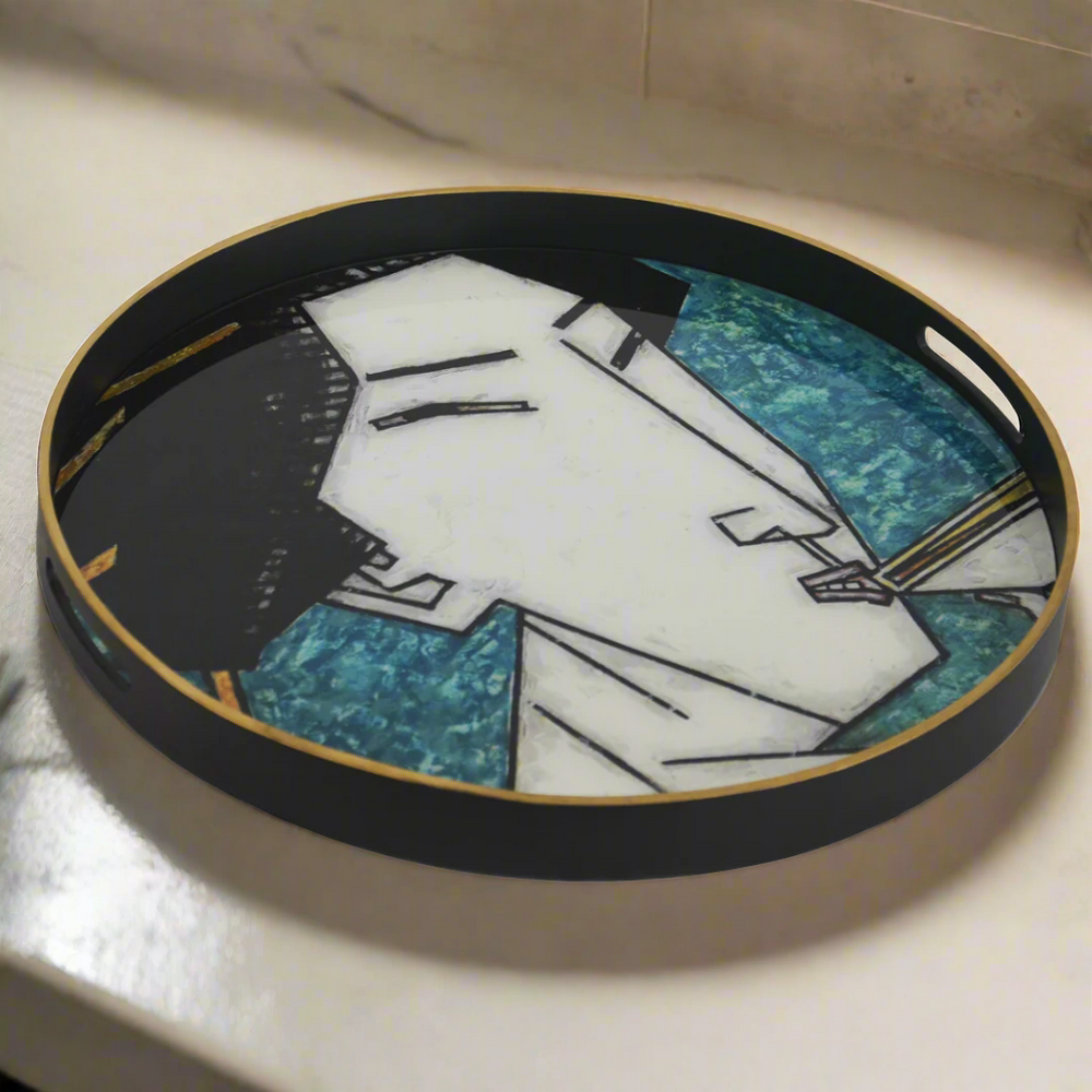 LARGE ROUND BLACK, WHITE & GOLD TRAY 6X49.5CM